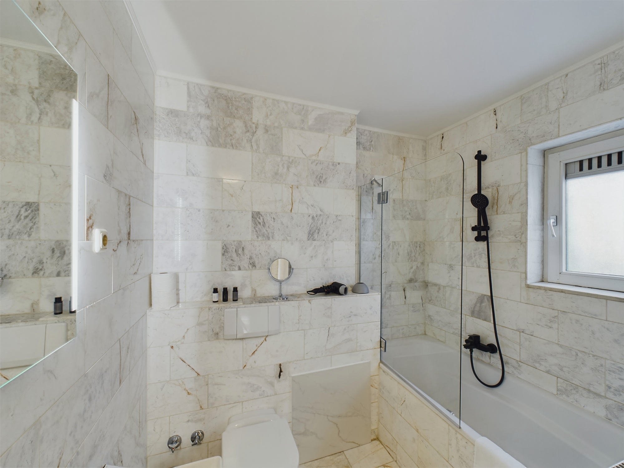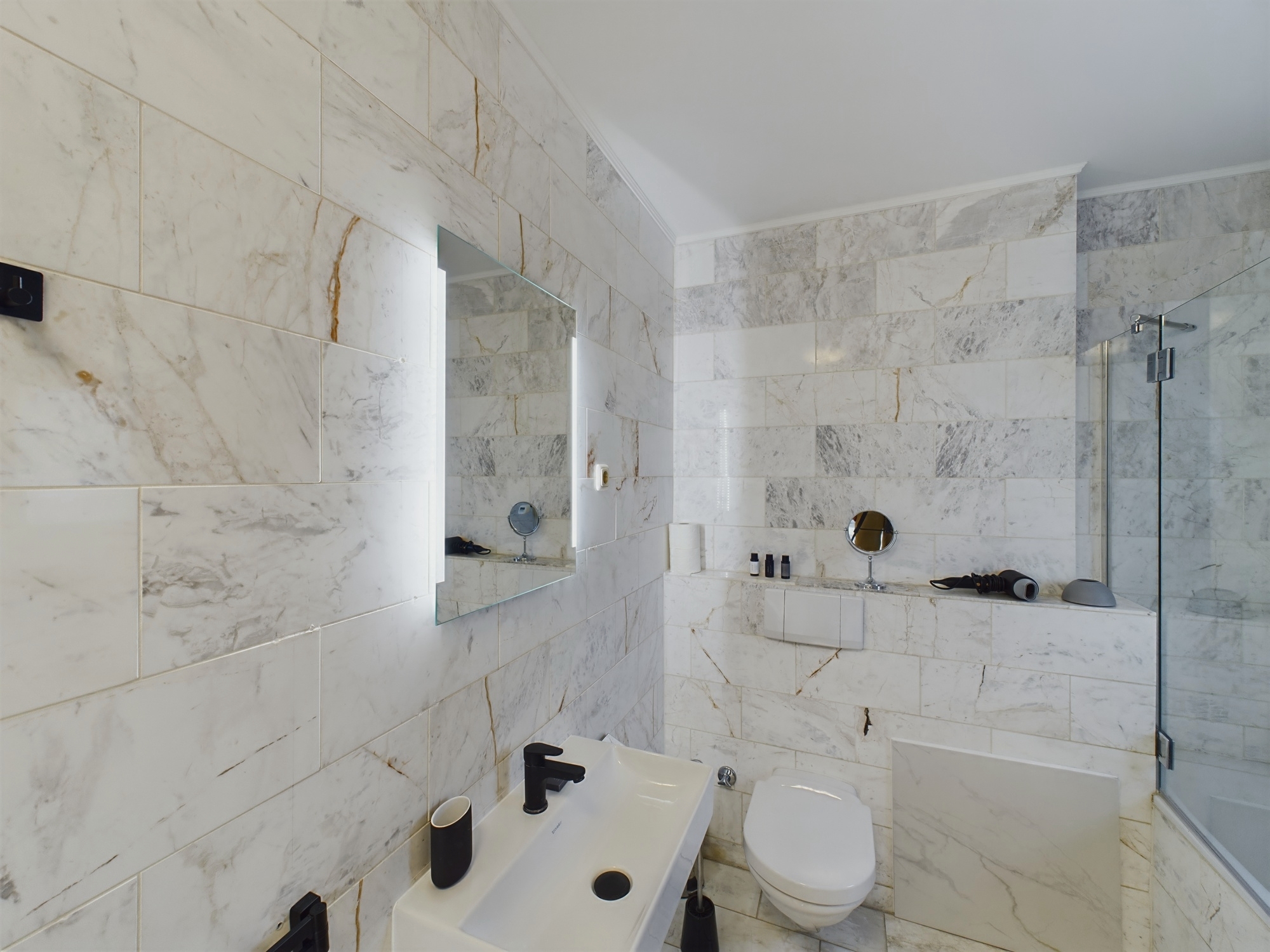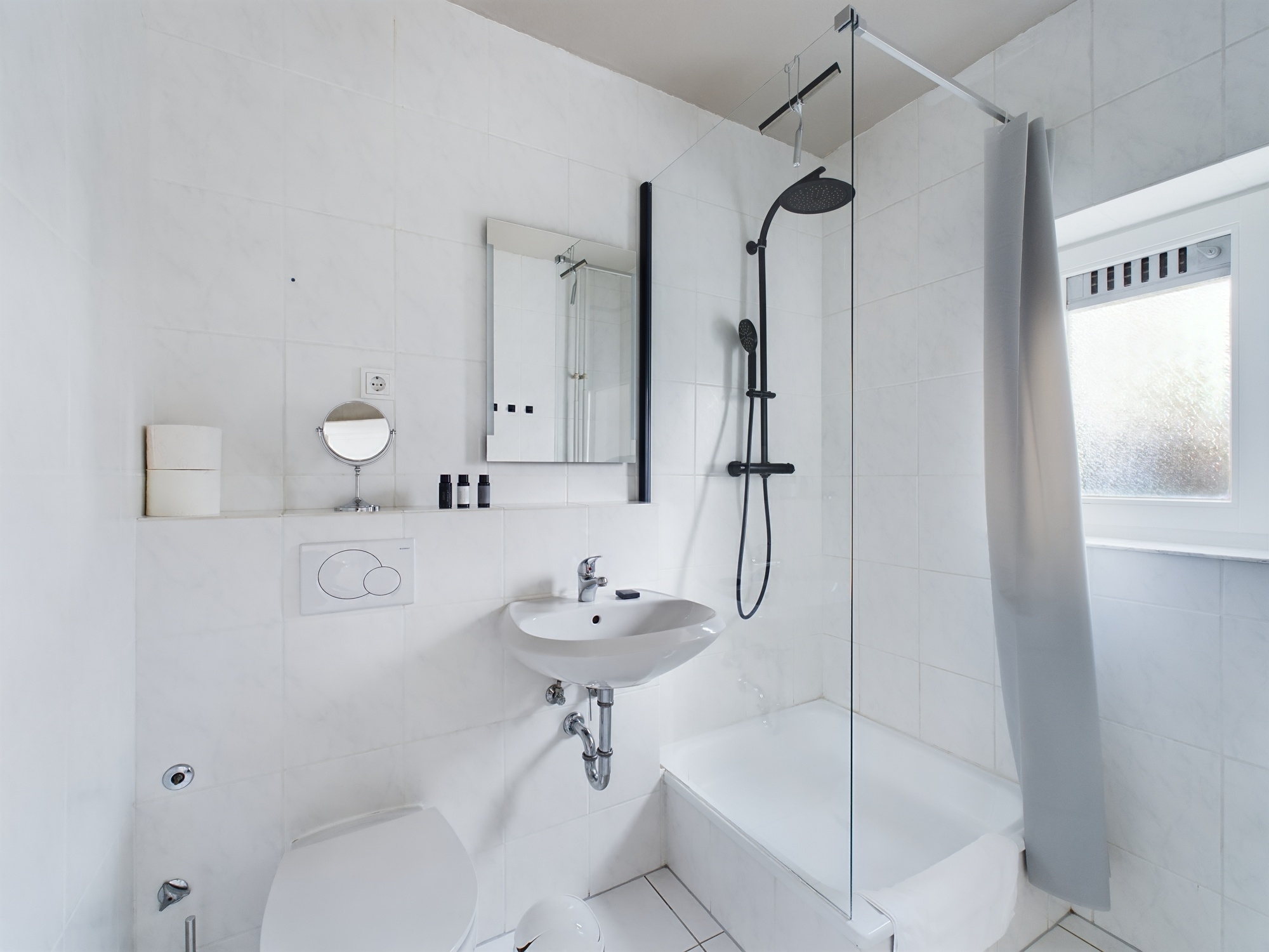 The modern, private kitchen is fully equipped, allowing for easy preparation of your own meals, while the stylish bathroom with a shower completes the high level of living comfort. A private balcony offers the perfect place to enjoy the view and city life.