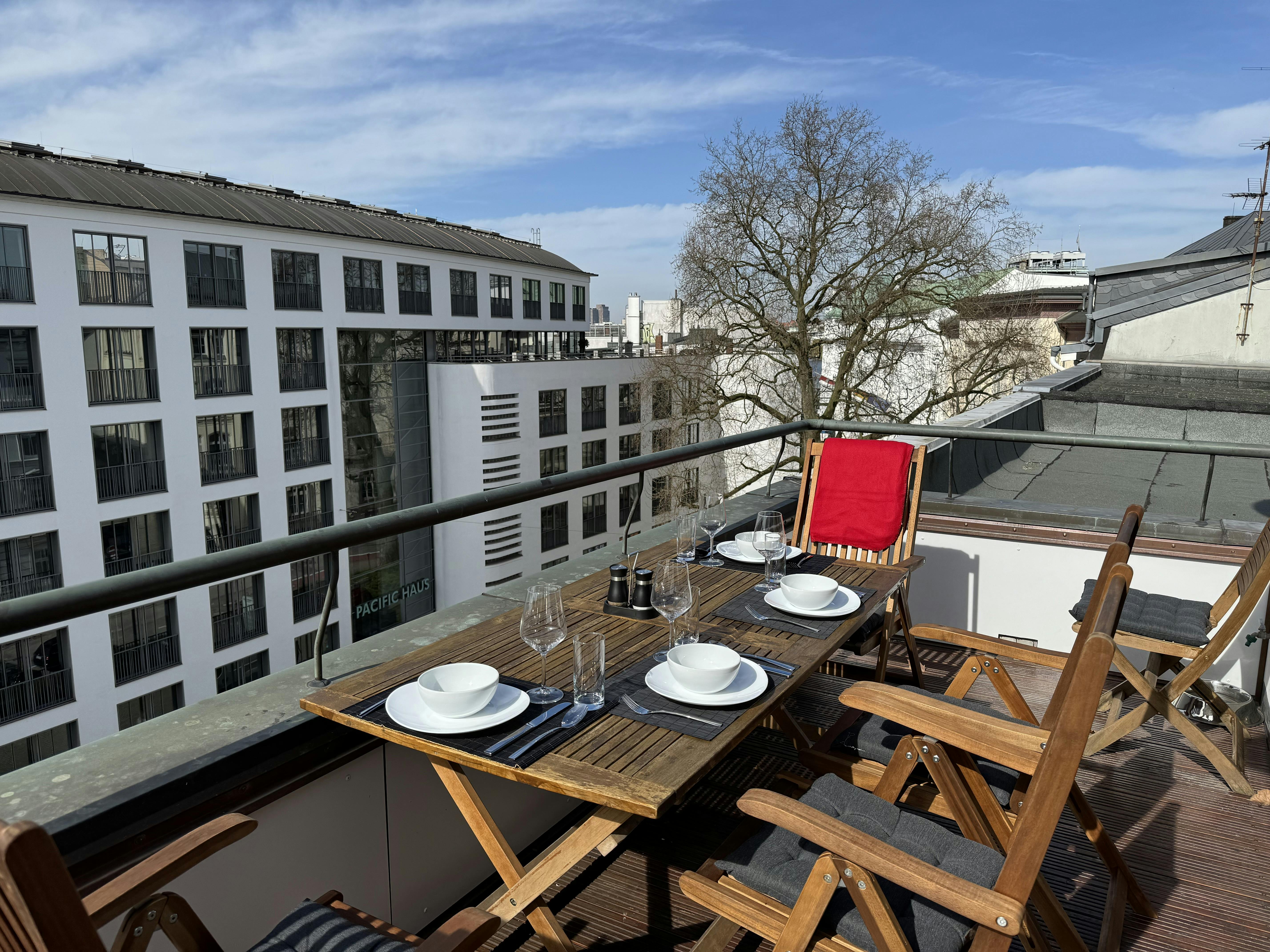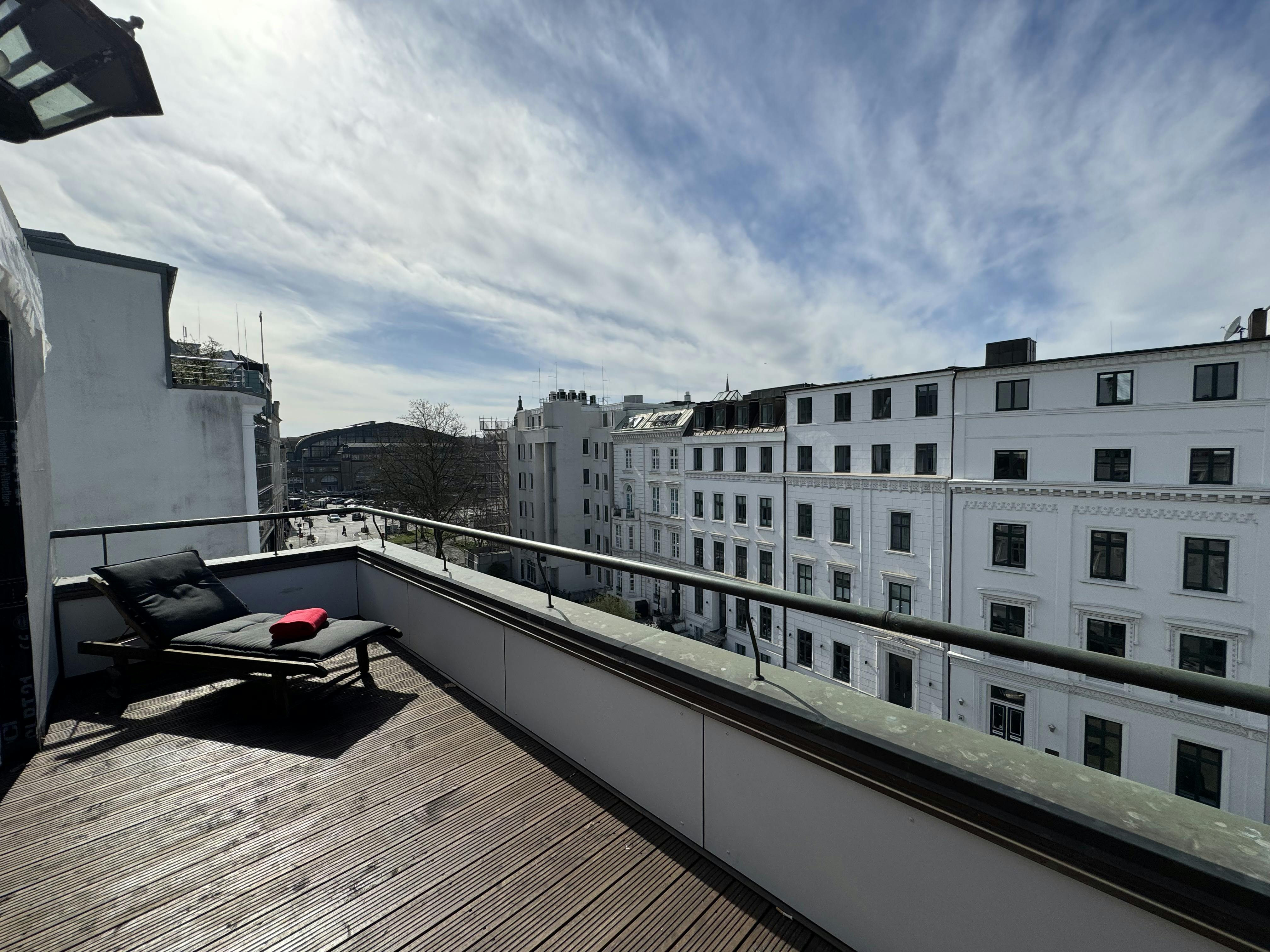 With 60 m², the apartment accommodates up to four guests. A comfortable bedroom with a double bed and a living room with an additional sofa bed ensure restful nights and relaxed moments. A large rooftop terrace, where you can even glimpse a small part of the Outer Alster, and the elevator that takes you directly to the apartment provide an absolute luxury factor.